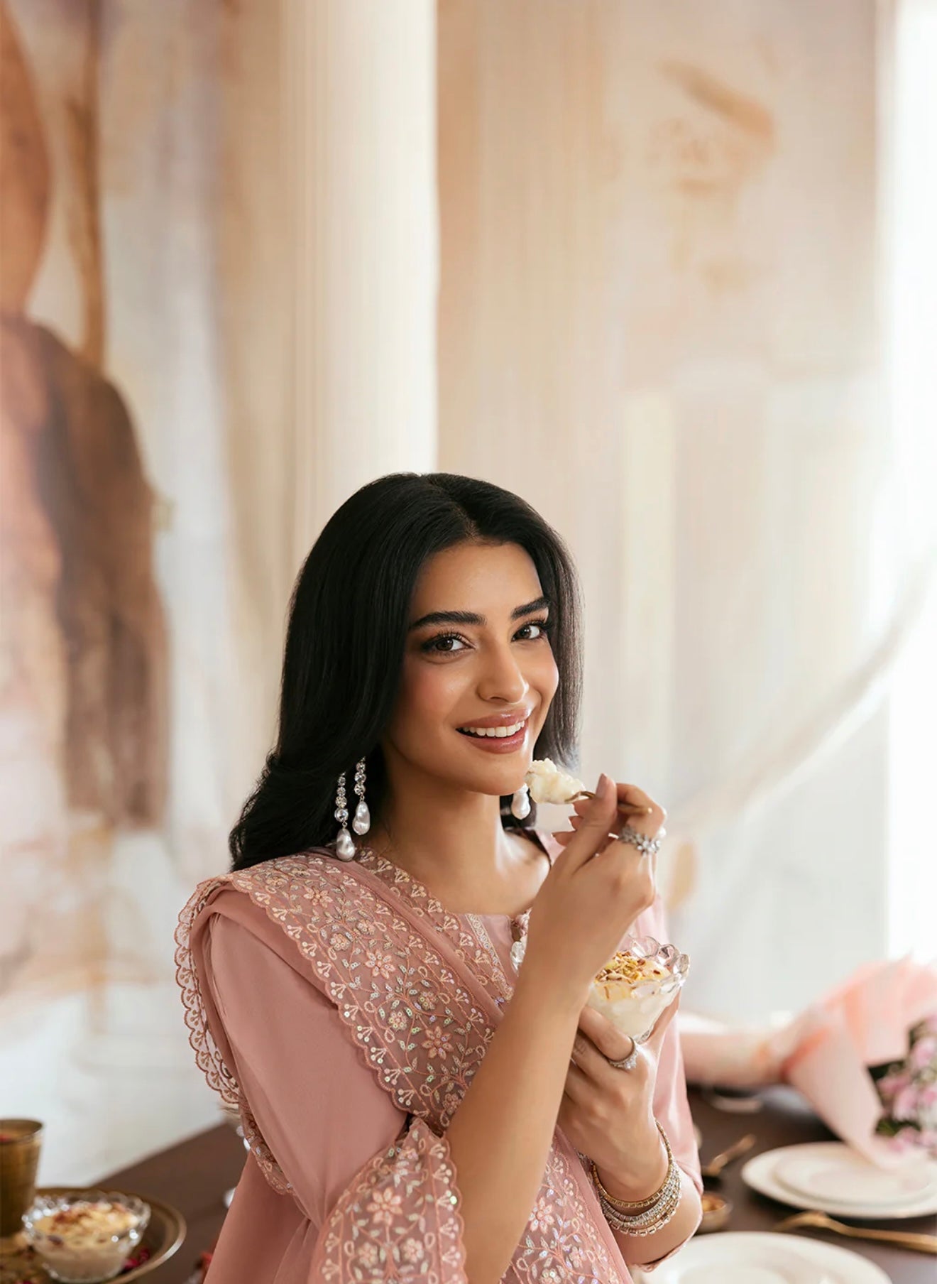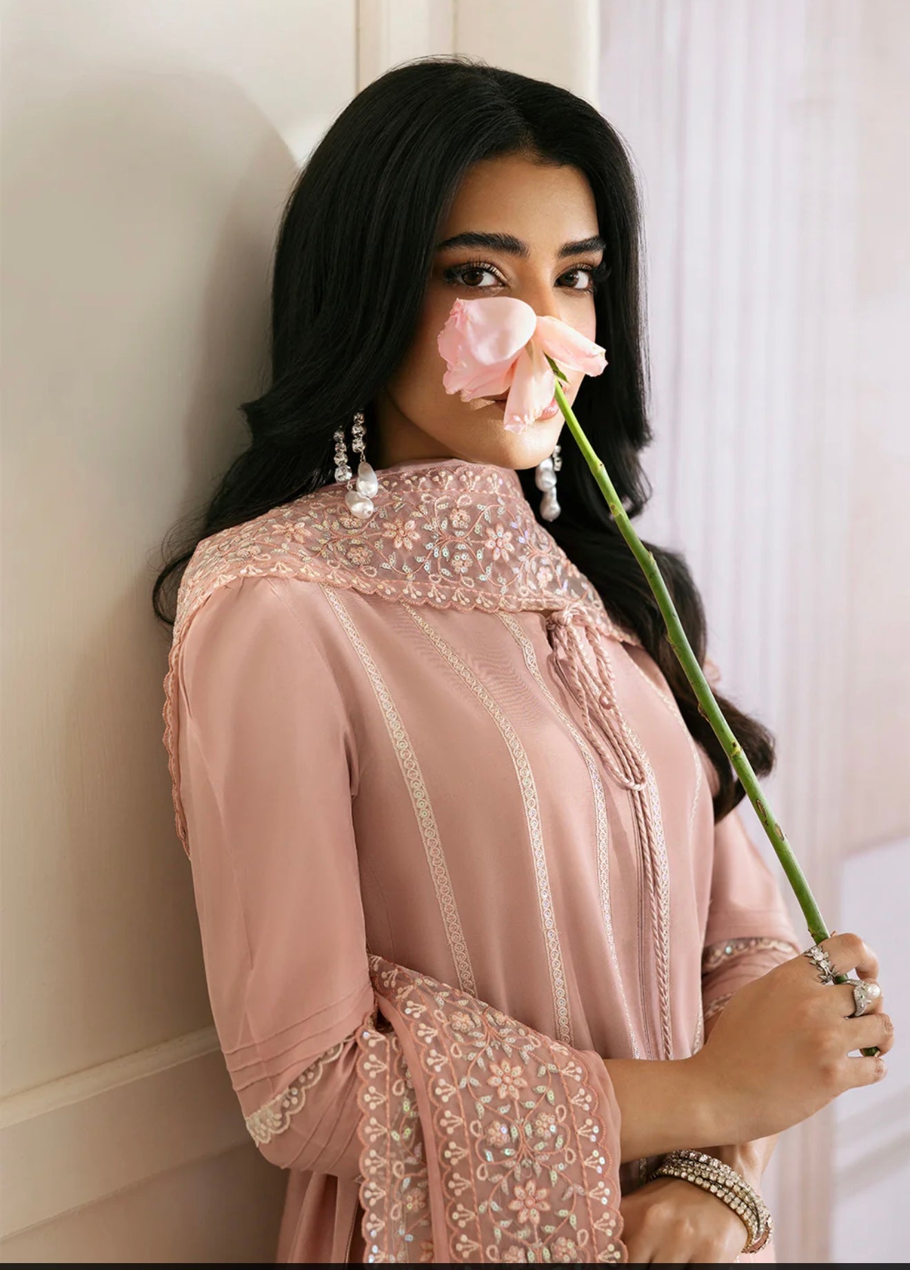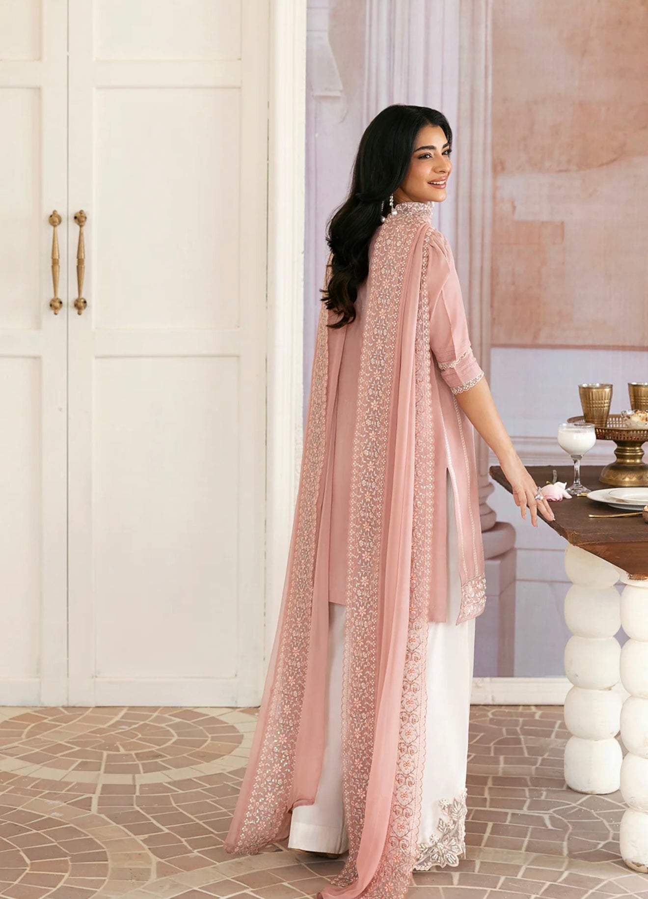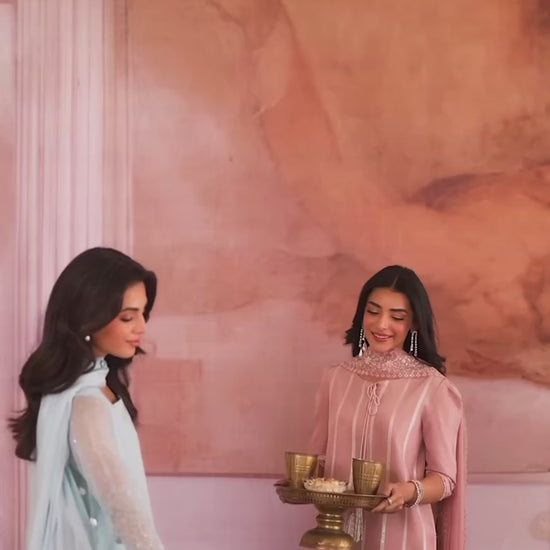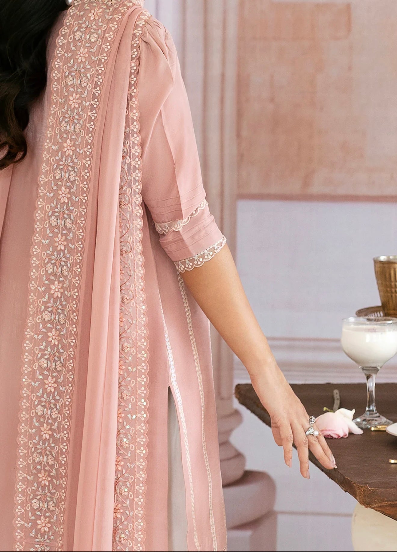 Peach silk embroidered shirt with puff sleeves, paired with off-white silk trousers featuring slit embroidery and hand embellishments and chiffon embroidered dupatta