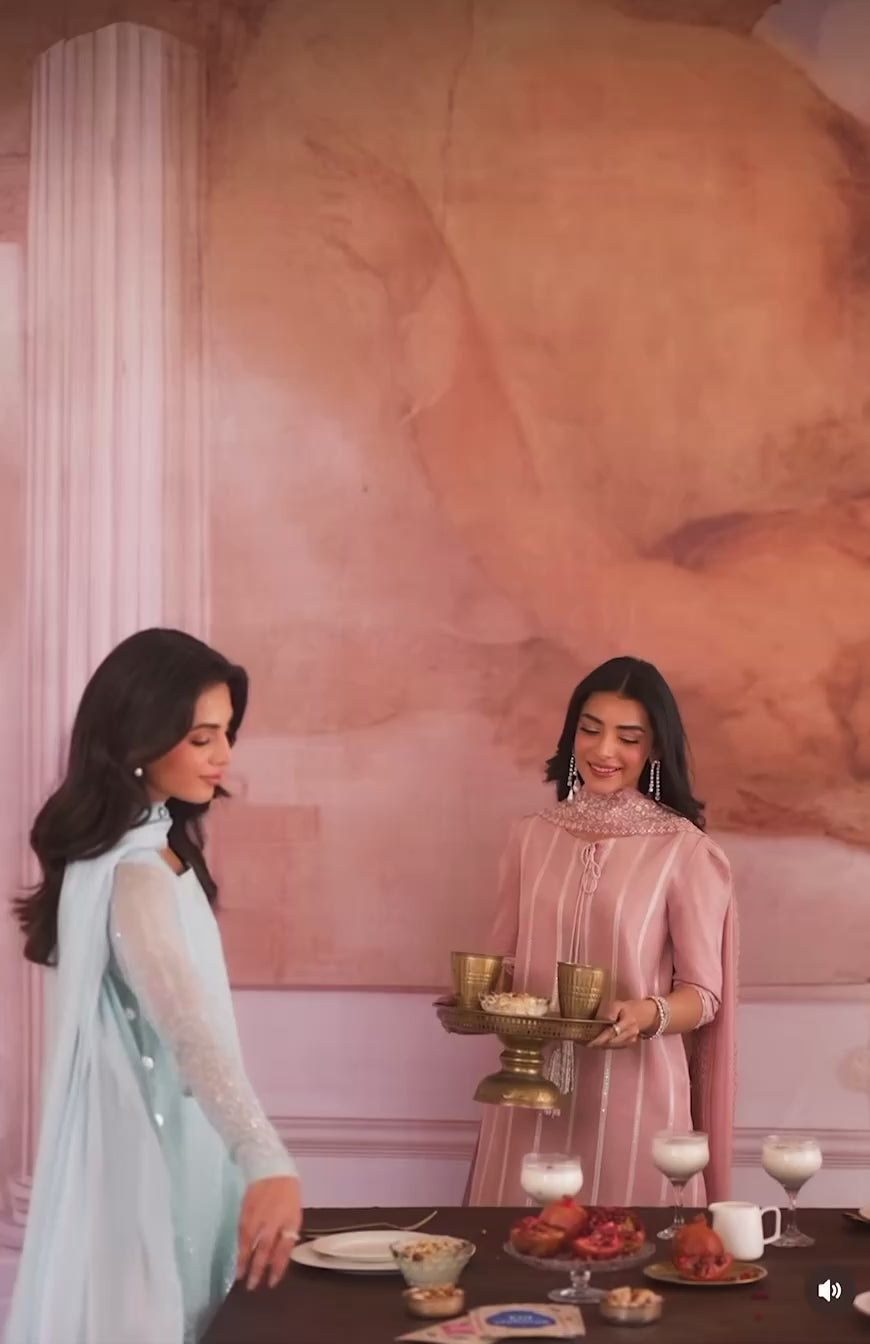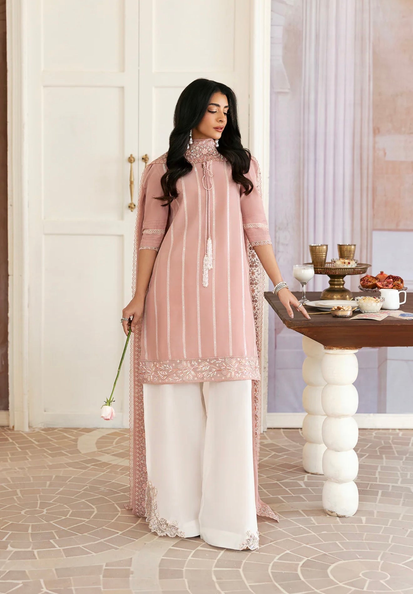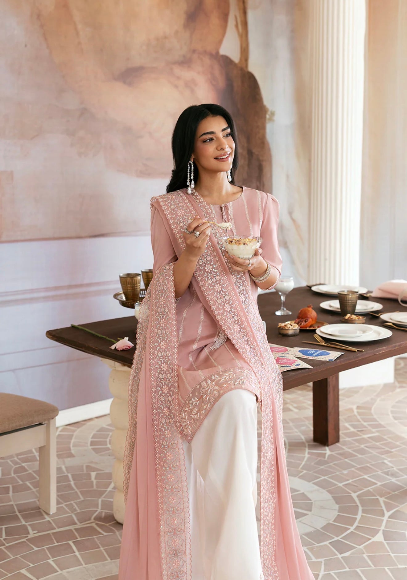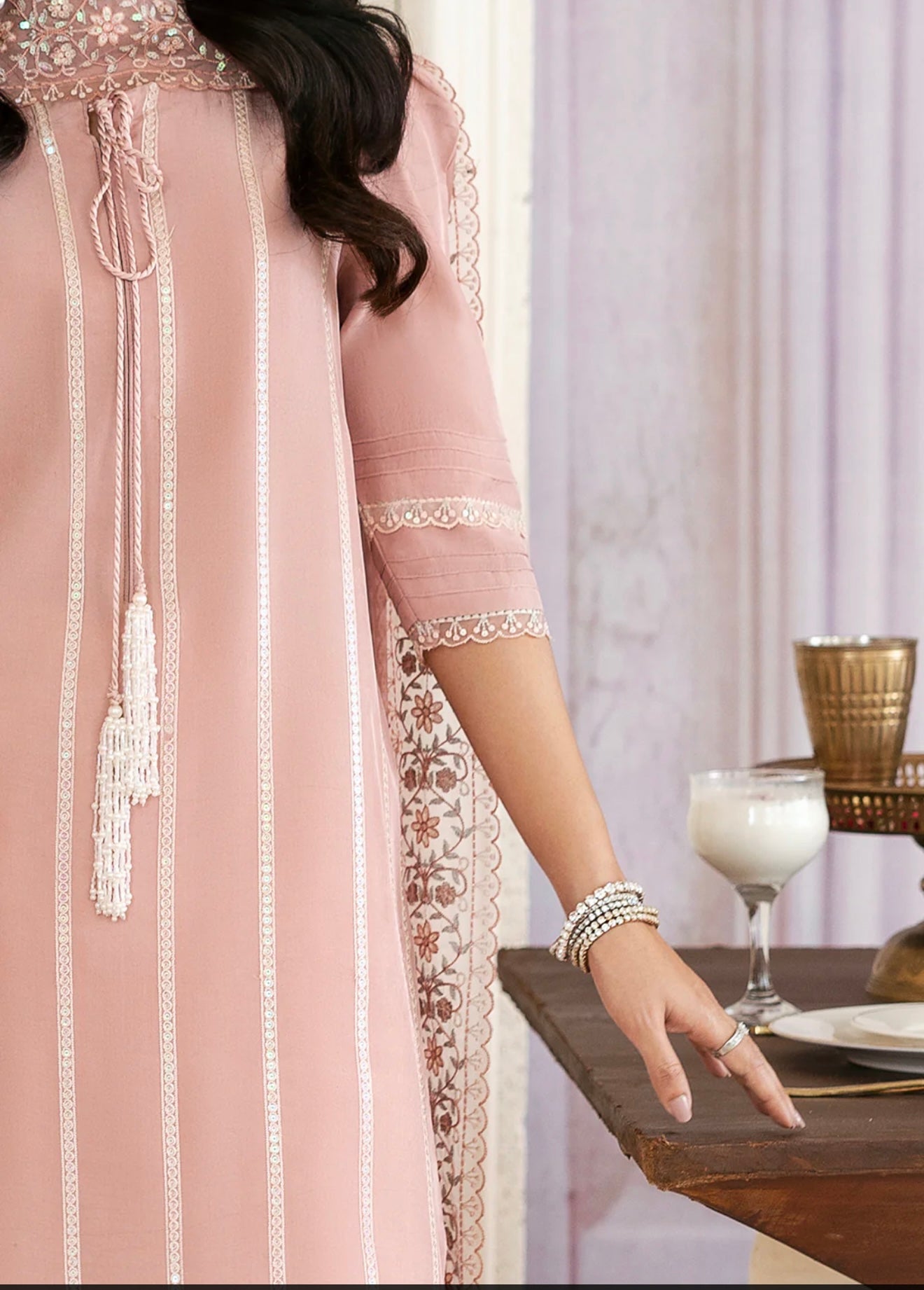 Peach silk embroidered shirt with puff sleeves, paired with off-white silk trousers featuring slit embroidery and hand embellishments and chiffon embroidered dupatta